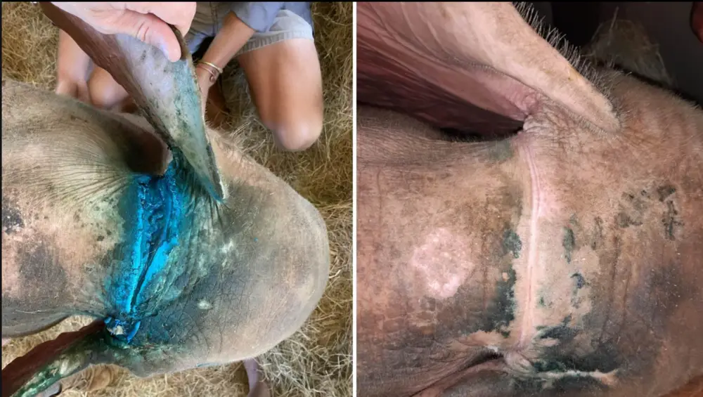 As she had lost part of her ear lobe and the veins were clotted from her injuries, sedation was very difficult. During the procedure the wildlife vet, Dr. Rogers, decided to stitch only the right ear, as it may be too uncomfortable for her doing both at the same time. Her ear injuries were positioned right in the crease where her ear flap. It was her right ear that was injured the most during her ordeal, as the top section of it had been sliced off too.