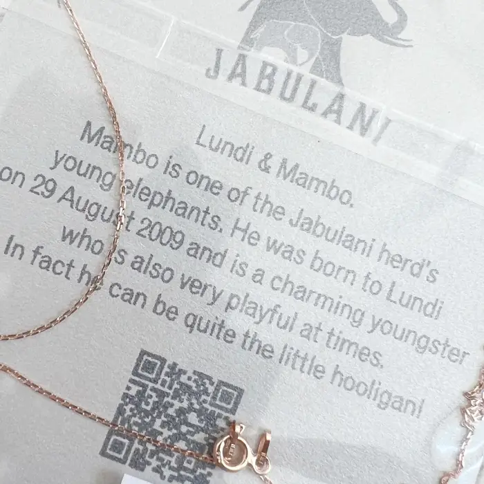 This necklace is based on Lundi & Mambo from the Jabulani Herd. mambo is one of the Jabulani herd’s young elephants. He was born to Lundi, on August 29th 2009 and is a charming youngster who is also very playful at times. In fact he can be quite the little hooligan!