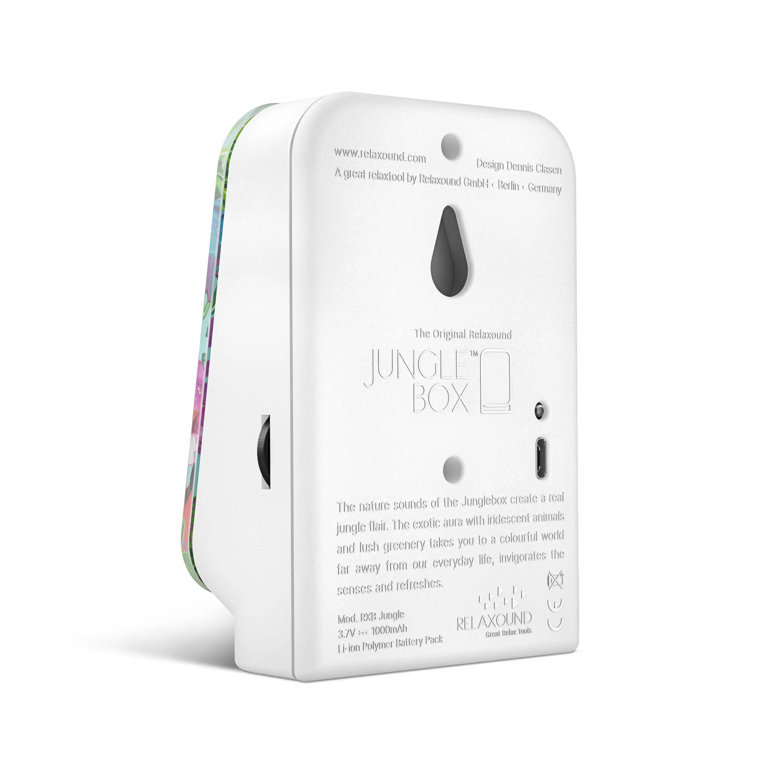 The nature sounds of the Jungle Box Tropic Forest take you to the tropical rainforest. A tropical paradise full of energy. You can place the Junglebox Tropic anywhere or hang it on the wall, at home, in the office, in the kitchen, in the toilet or in the bathroom.